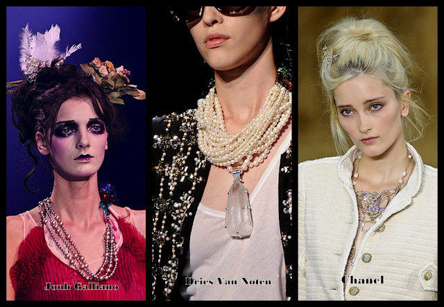 Acima as pérolas aparecem como cinto na modelo Reem Acra(sorry, esqueci de colocar) e misturadas nos colares com tecidos , dando a idéia dos maxi-colares.