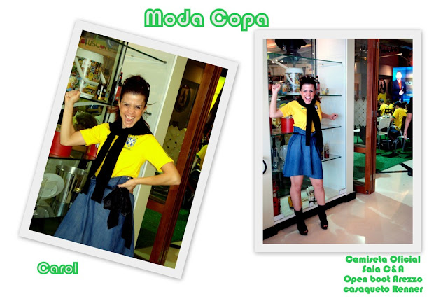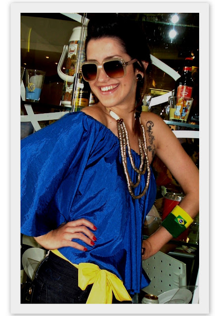 A Camisa da seleão ficou fofíssima com a saia azul anil (C&A;) e os complementos em preto para dar o acabamento.Não é preciso se fantasiar de jogador, nem pintar a cara com guache para estar no clima da copa, é lógico que tudooo tem o tãooo comentado bom senso!!! lógico que se você está assistindo jogo num estádio é cabível estar de camiseta e cara pintada, que fique claro que a gente não tem nada contra o guache rolando solto nas bochechas de quem está no estádio torcendo loucamente.