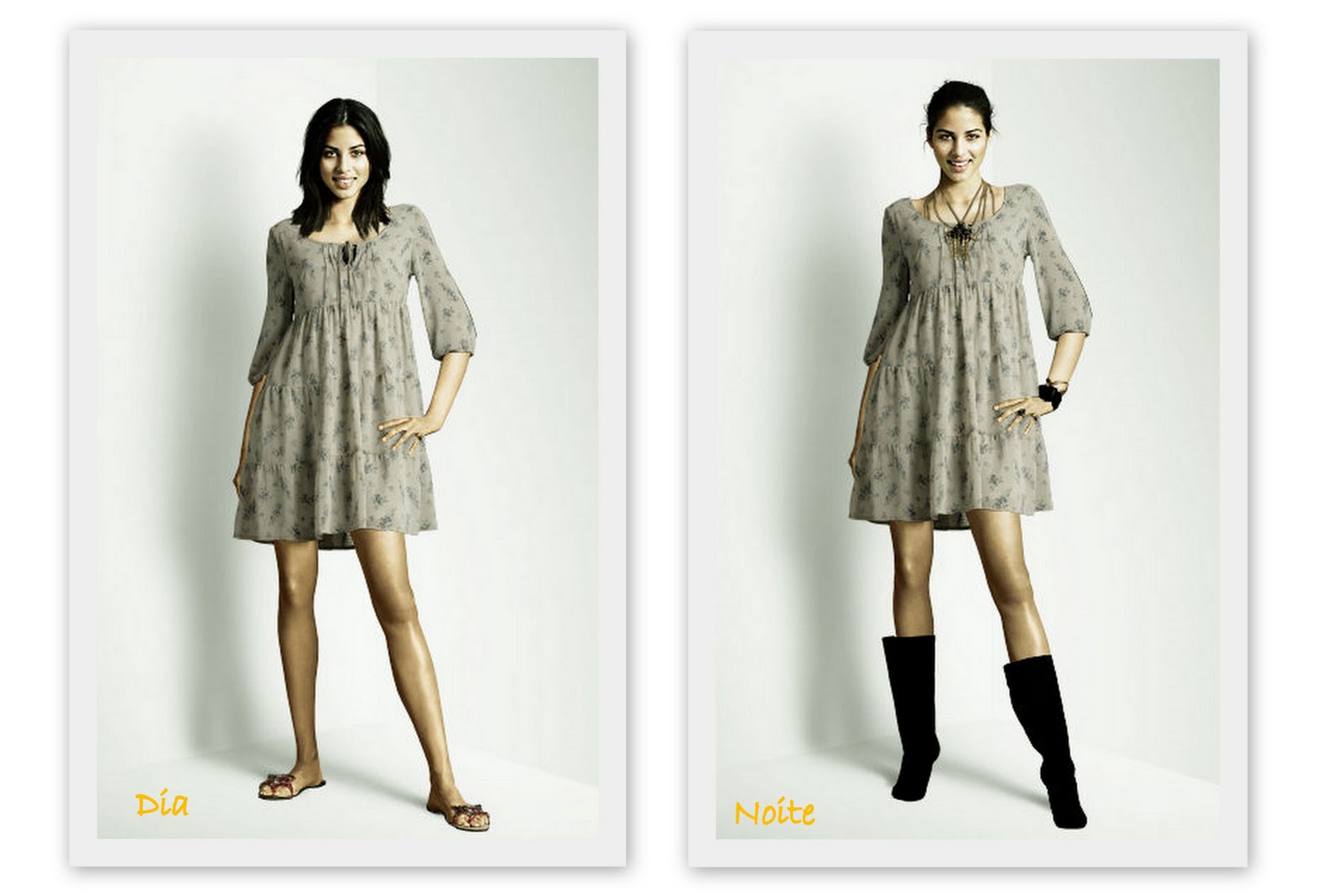 E também varia, se for uma balada, dá pra fazer um olho, mais elaborado. Se não, blush, batom, corretivo e rímel, tirei a cara do dia todo. Depende, pra onde vou. Roupas E a roupa, como falei praticidade, algumas vezes, precisam ser incorporadas, não é sempre que dá pra sair com aquele malão, né? Bom, nada mais prático que vestido. Por isso, montei três looks no Looklet (bonequinha de papel digital, quem lembra??) Só, pra gente ver como uma peça de dia pode virar noite, com alguns toques, de acessórios e mudanças pequenas..